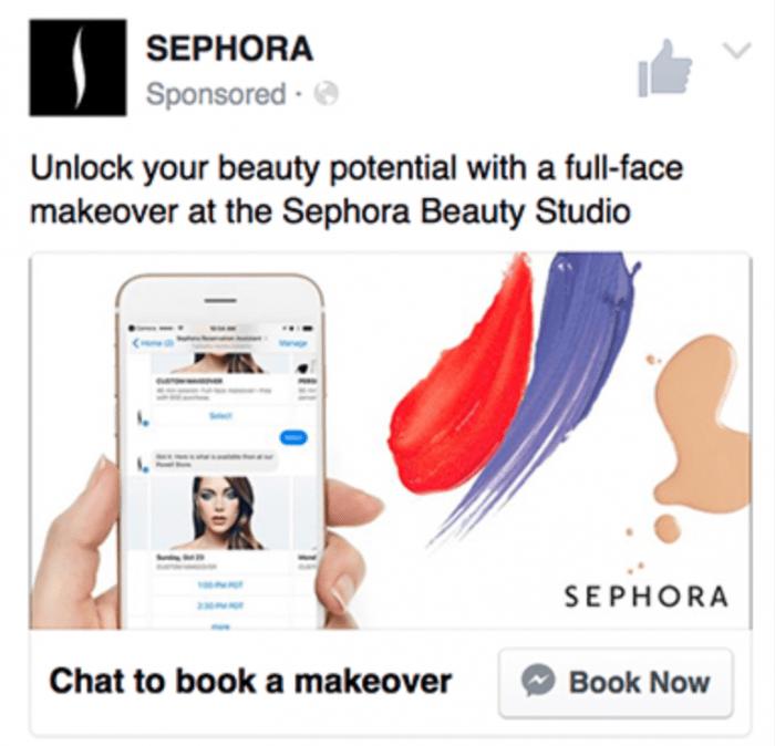 Let’s talk about one of Sephora’s most successful campaigns. The goal was to have more customers book a makeover. They did this by running Click-to-Message ads including the CTA button “Book Now”. When customers started a chat, a chatbot guided them through the booking process.