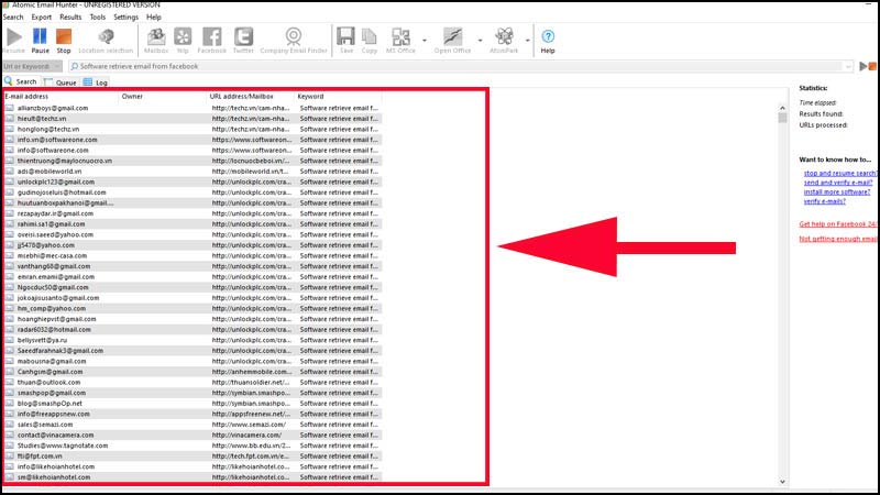 Step 5: The screen will display the results of email addresses. Please copy them.