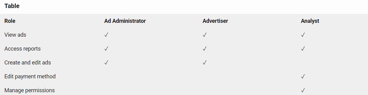 - Ad Administrator: This role allows users to view ads, access reports, create and edit ads, and manage permissions.
