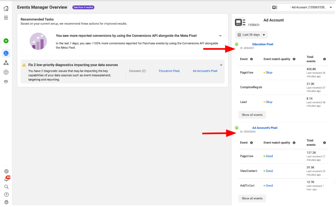 Step 3: In the Events Manager, you should see all your data sources and new Pixels. Under the Pixel name is the Facebook Pixel ID number you’ve been looking for.