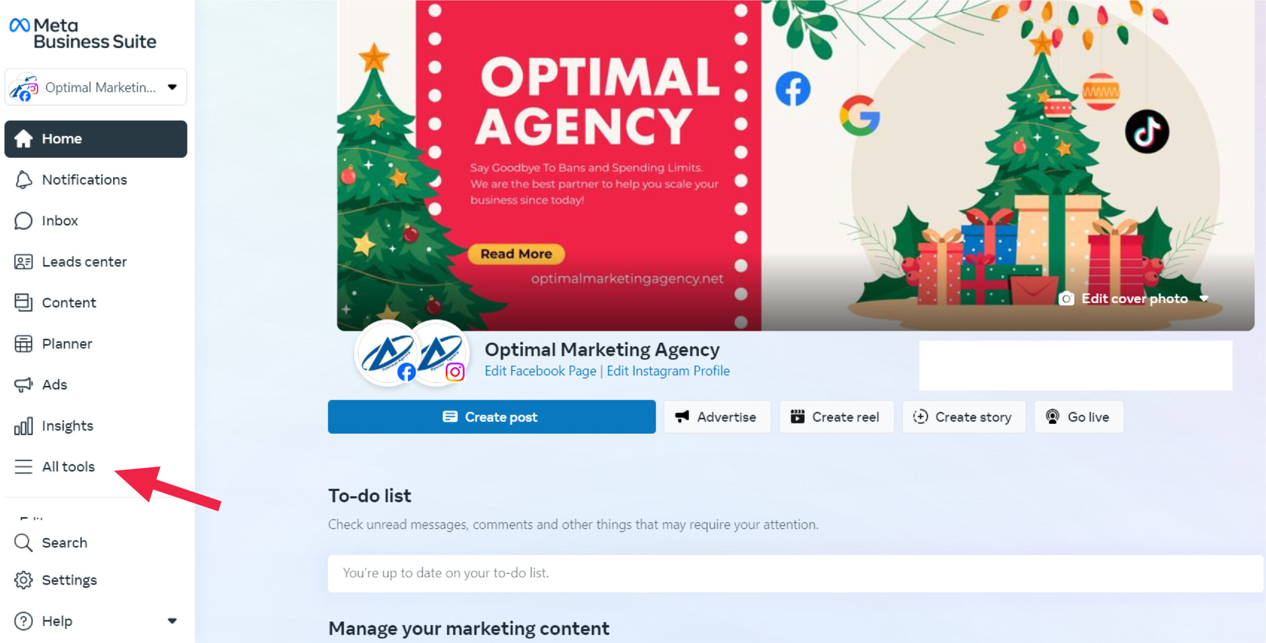 Step 1: Log into your Facebook Business Manager (this is where ad campaigns and Facebook Pixels are managed). Then, in the left-hand menu options, click on “All tools”.