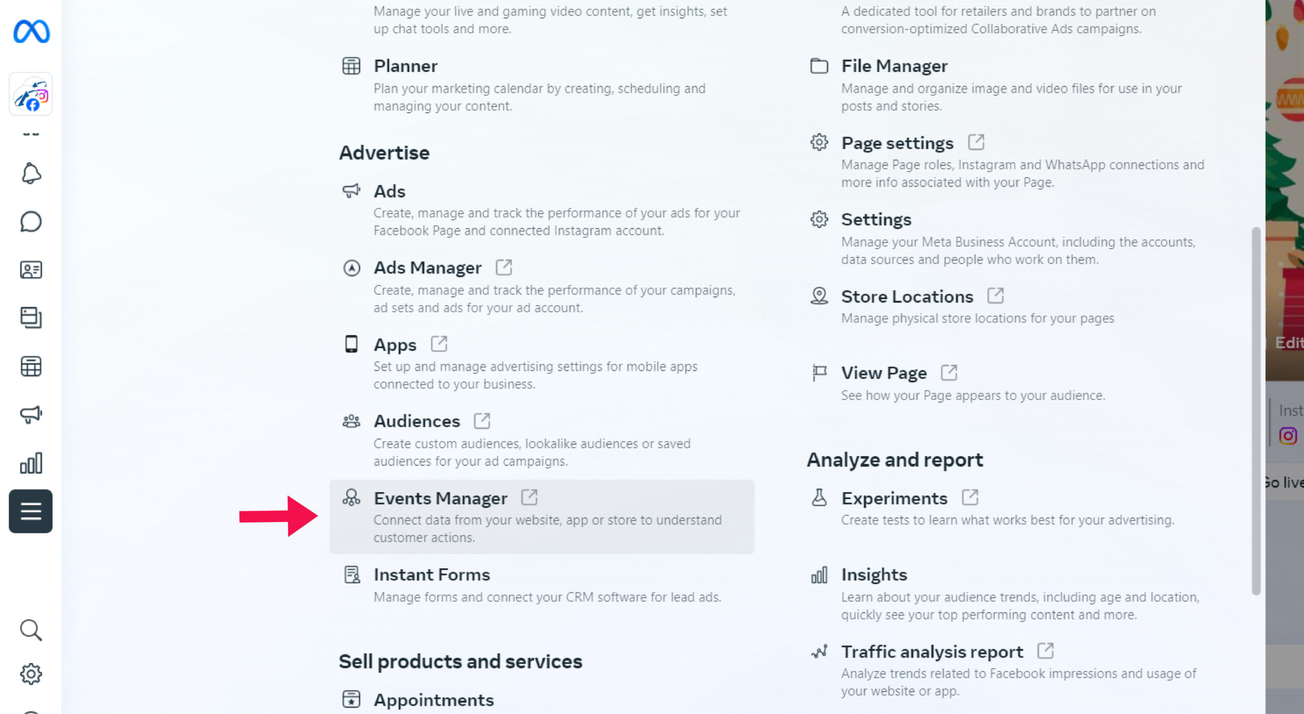 Step 2: On the pop-up menu page, scroll down to the “Events Manager”. A new page will pop up – this is the hub of all your events.